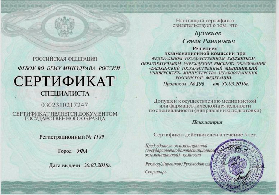 • 2013 — Башкирский Государственный Медицинский университет (ординатура по специальности «психиатрия»)